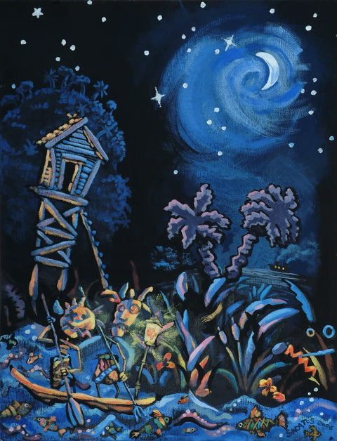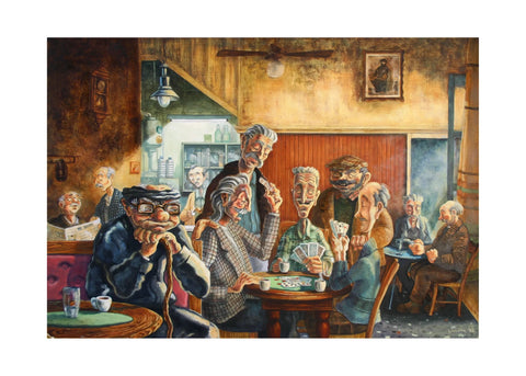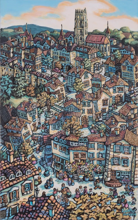 Currently based in Switzerland, Sacatos has spent over two decades creating distinctive paintings and drawings that capture the landscapes and people of New Zealand, Greece, and Switzerland with what he describes as "a cartoony, or gently satiric edge."